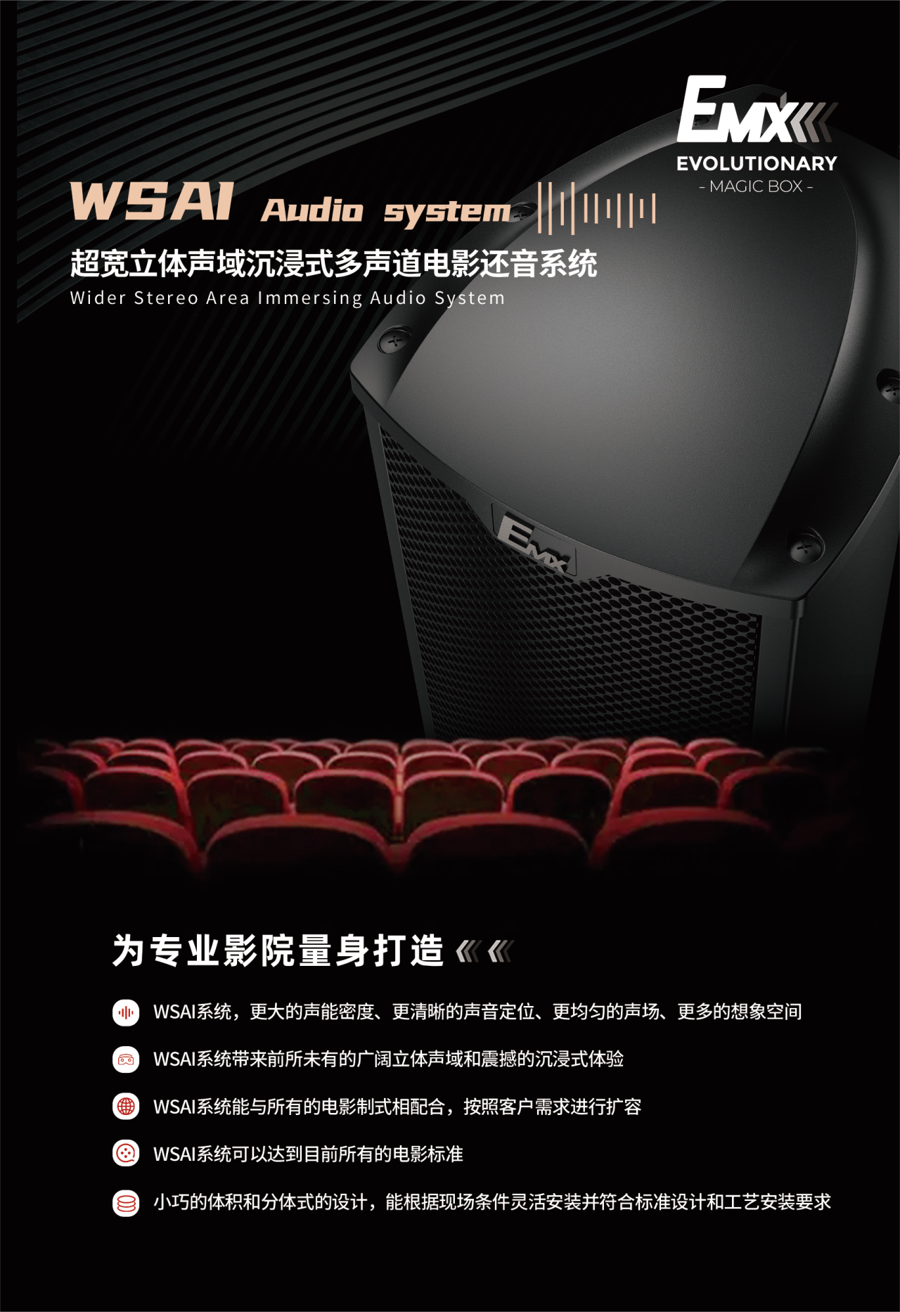 這次EMX 向市場推出的DC系列專業(yè)影院揚(yáng)聲器系統(tǒng)是其在武商摩尓影院20米超大LED屏幕系統(tǒng)獲得成功之后開發(fā)的又一個(gè)新力作。由DC系列構(gòu)成的超寬立體聲域沉浸式多聲道還音系統(tǒng)(簡稱“WSAI”或“威賽”還音系統(tǒng))徹底顛覆了傳統(tǒng)影院的擴(kuò)聲系統(tǒng)概念。解決了一直困擾著LED屏和不透聲幕的“聲音問題”。為LED屏市場化掃清了一個(gè)系統(tǒng)上的關(guān)鍵障礙。